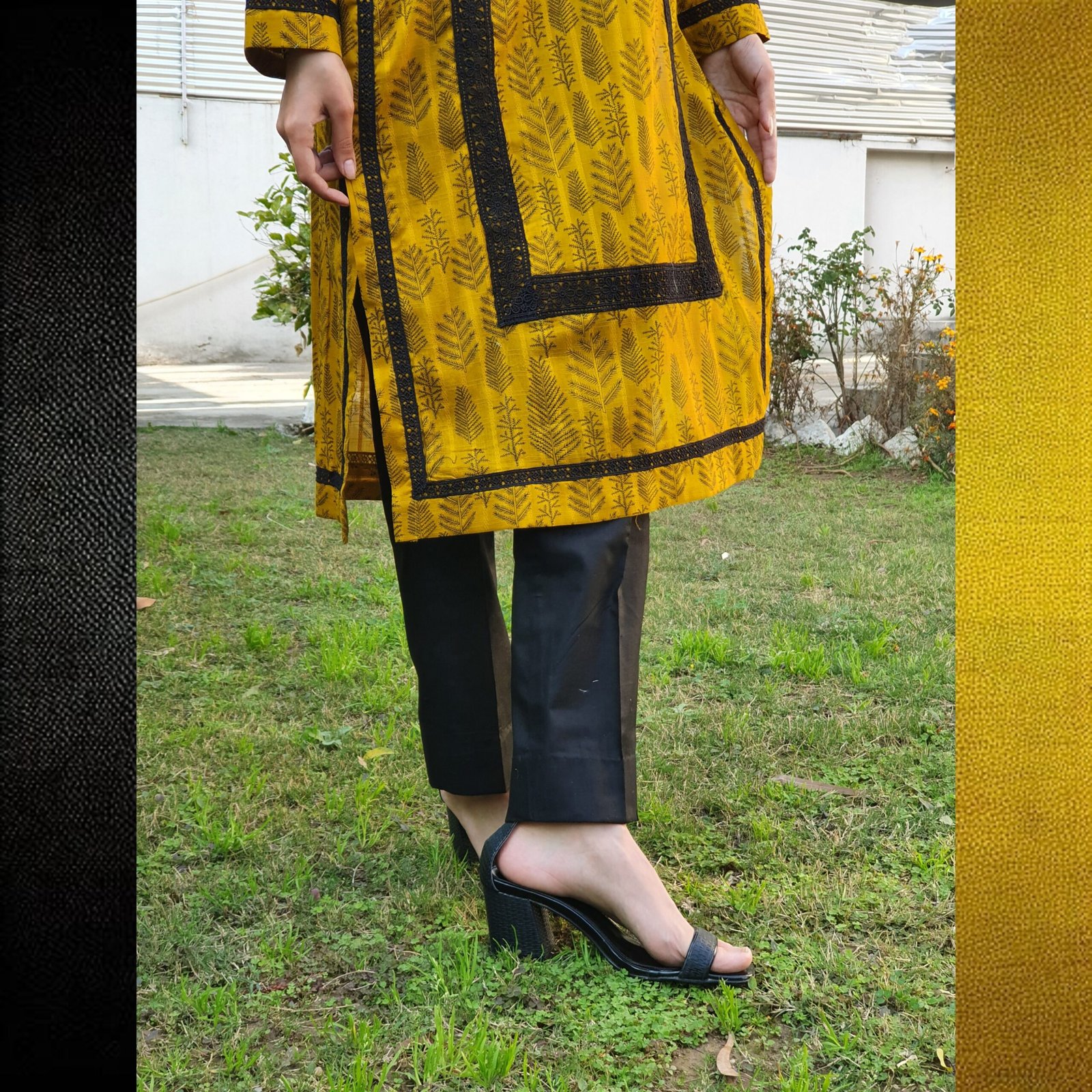 Golden Fern In Mustard-yellow color and the delicate black fern-like print that adorn the fabric.