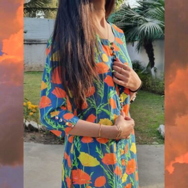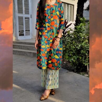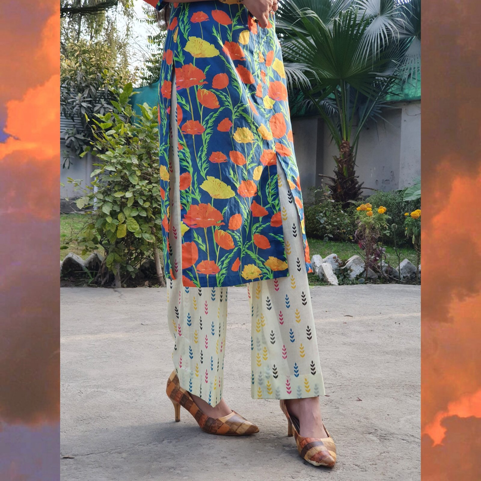 Sunset Garden Ensemble-Bold orange and yellow floral patterns on a deep blue base, evoking the beauty of a blooming garden at sunset